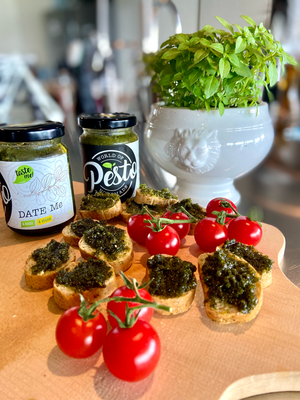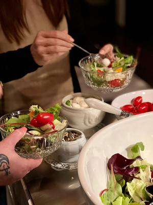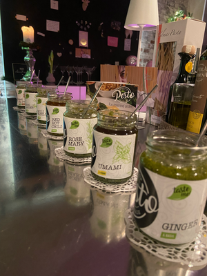Dazu: frisch geriebener aromatischer Parmesan, Pesto Saucen, knackiger Salat, knuspriges Brot und erlesener Hauswein.